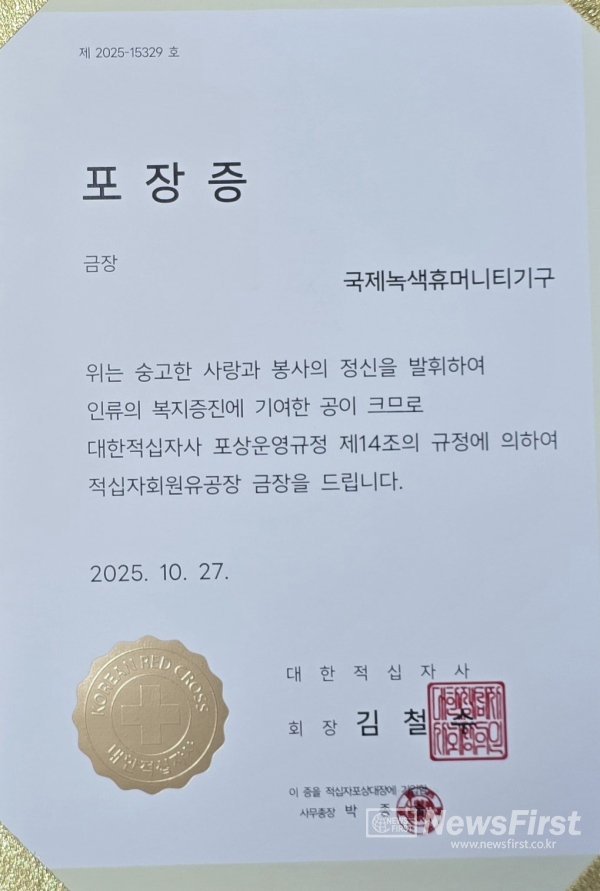 UN ECOSOC NGO FLML 국제녹색휴머니티기구(총재 박창수)가 대한적십자사로부터 "숭고한 사랑과 봉사의 정신을 발휘하여 인류의 복지증진에 기여"한 공으로 2025.10.27자로 '사랑.봉사 금장'을 수여받았다.