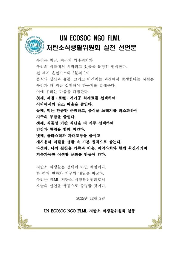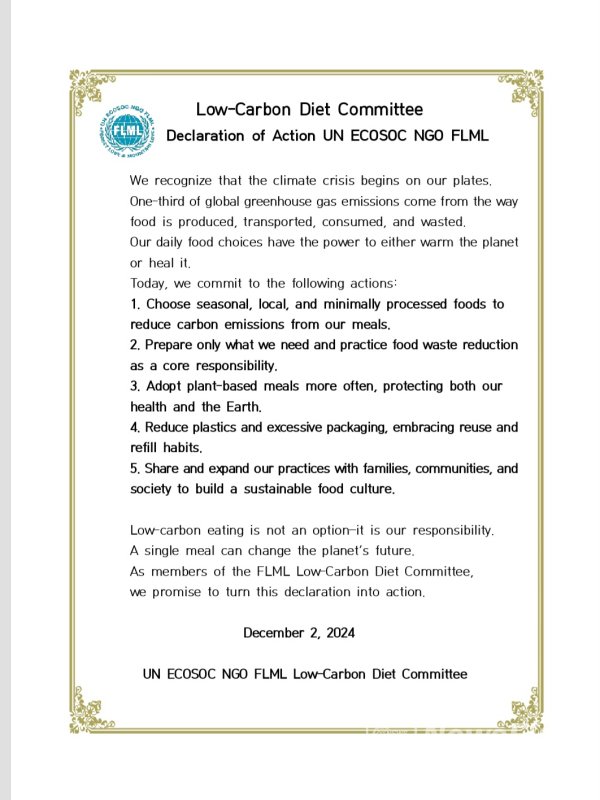 UN ECOSOC NGO FLML 국제녹색휴머니티기구 및 탄소중립실천범국민운동본부(총재 박창수)는 2025.12.2.서울대학고 호암교수회관에서 개최된 정례회의에서 저탄소식생활위원회(위원장 김규림)가 중심이 되어 "저탄소식생활실천선언문"을 발표하였다.